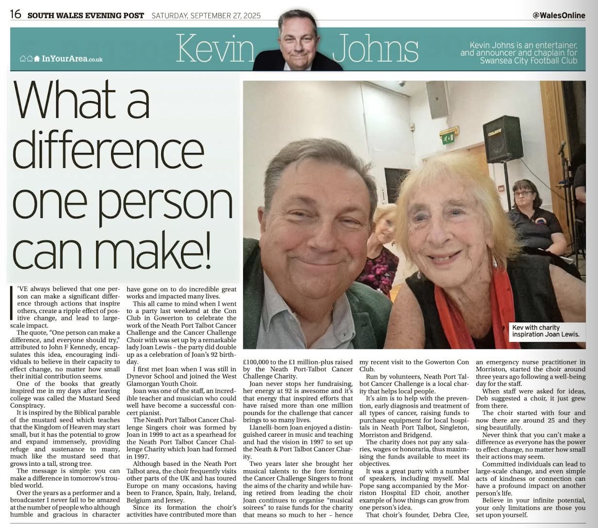 ![]() Gwen Shenton, MD of the Cancer Challenge Choir, shows her medal for completing the 2025 Swansea Half Marathon during which she raised over £1,000 | ![]() Geraint Jones, the Cancer Challenge Choir's treasurer presents a cheque for £2,500 to Mr. Peter Jones at the Choir's Annual Concert in September 2025 | ![]() South Wales Evening Post article written about the Charity and Choir by Kevin Johns |